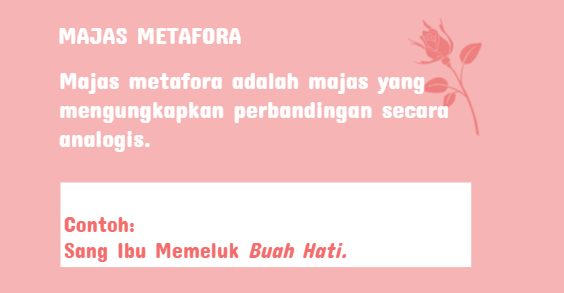 Contoh majas metafora adalah majas yang digunakan untuk menggambarkan perbandingan analogis pada dua perkara yang berbeda. Dia dikenal sebagai kutu buku di kelas kami. Berikut artikel yang bisa kamu jadikan referensi karya tulis terbaik buatanmu. Menggunakan majas metafora dalam sebuah kalimat dan pragraf membuatnya semakin indah. Si jago merah membakar habis ruko di pasar tersebut.