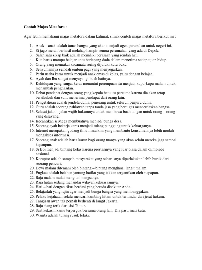 Majas metafora merupakan sebuah majas yang sesuatu dengan melakukan perbandingan langsung dan juga tepat terhadap dasar sifat yang hampir sama agar kamu dapat lebih mudah memahami apa itu majas metafora, maka dari itu kami menyediakan beberapa contoh kalimat yang telah disisipi. Kesan itu juga akan berpengaruh dalam. Majas biasa digunakan dalam puisi, cerpen, maupun novel untuk menambah nilai seni pada kalimat agar terlihat menarik dan tidak membosankan. Polesan kata kiasan ini memberi ruh pada karya anda jika menggunakannya dengan tepat. Bahkan metafora dapat mempermudah pemahaman pendengar atau pembaca tentang sesuatu yang rumit. Contoh majas metafora adalah majas yang digunakan untuk menggambarkan perbandingan analogis pada dua perkara yang berbeda. Majas metafora ialah majas yang menggunakan objek yang sifatnya sama dengan suatu pesan yang ingin disampaikan melalui ungkapan. Berikut pengertian dan 101 contoh kalimat yang menggunakan majas atau gaya bahasa metafora yang termasuk dalam majas perbandingan. Apakah kalian tahu bahwa majas metafora ini sering sekali dianggap 'ratu' nya majas? Perasaanku sejernih embun pagi 4. Menurut newmark, metafora ini biasa digunakan untuk menggantikan ungkapan. Pada kalimat ini secara jelas mengungkapkan bahwa diska merupakan gadis yang sangat cantik di desa. Rumahnya habis dilalap si jago merah.